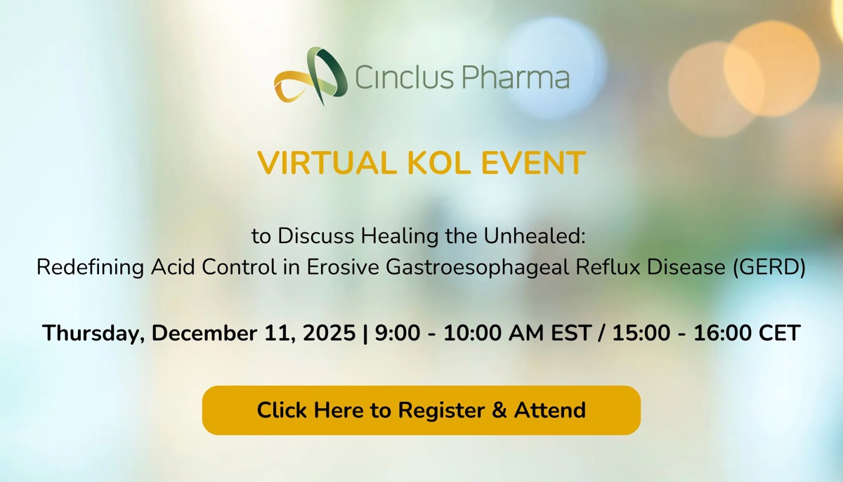 Cinclus Pharma Holding AB (publ) will host a virtual event featuring Professor Prateek Sharma from the Cancer Center in Kansas City, to provide deeper insights on the current treatment landscape and the unmet medical need among patients with erosive GERD, as well as the potential of Cinclus Pharma’s drug candidate linaprazan glurate. The event will take place on Thursday, 11 December, 15:00–16:00 CET / 09:00–10:00 AM EST.
